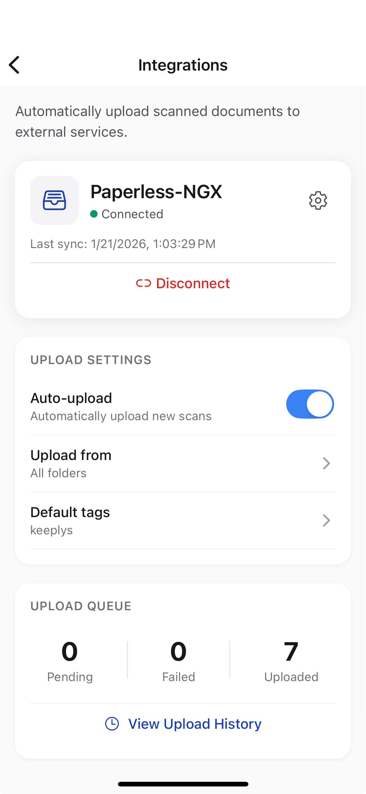 Pending uploads are cancelled when you disconnect. Completed uploads remain in Paperless.