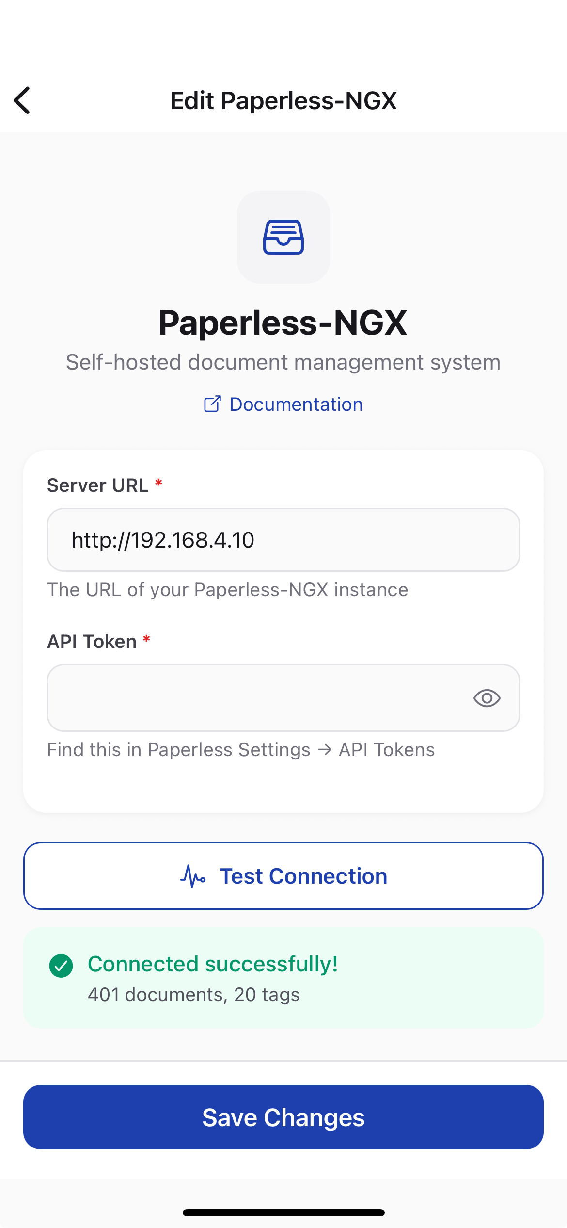 | Server URL | Your Paperless server address (e.g., https://paperless.yourserver.com) |